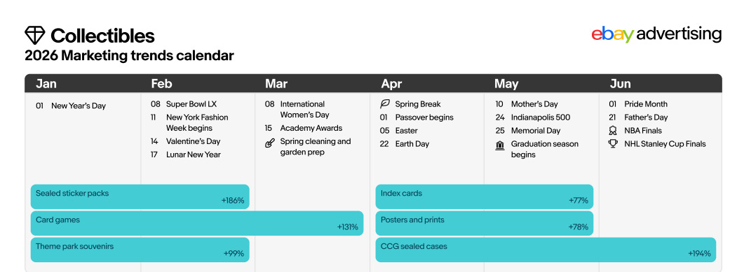 eBay Advertising’s 2026 Marketing Trends Calendar is a data-driven, month-by-month guide to buyer behaviour across five core categories: Collectibles, Electronics, Fashion, Home & Garden, and Parts & Accessories. It’s built on eBay’s own first-party purchase data from December 2024 to November 2025, mapped against the cultural and seasonal moments that actually moved the needle.