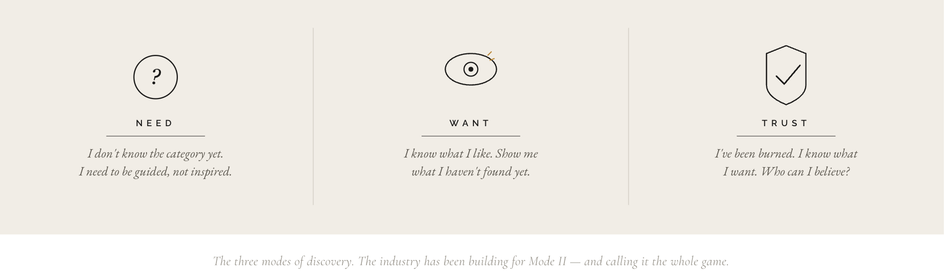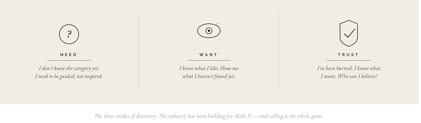 There are at least three modes of discovery in ecommerce, and they have almost nothing in common except the word applied to all of them. The first is contextual need: you don’t know what you need because you have never been in this situation before. The second is want-state browsing: you know broadly what you like and you’re open to being surprised. The third is trust validation: you know exactly what you want, but you’re using discovery signals to confirm a decision you’ve almost already made or to establish that the brand can be believed at all.