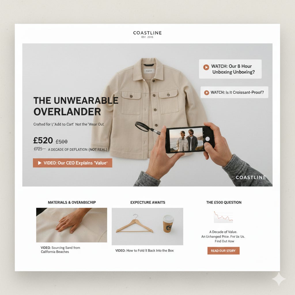 Let me start with a product. A jacket. £500. Hang it in your mind like it’s in a shop window on a rainy Tuesday in November. It’s beautiful. It’s aspirational. It’s the kind of thing your customer pins to a mood board, screenshots for later, and comes back to at 11pm after a glass of wine. Or two. Or 3. Hey, it’s Friday sin’t it?