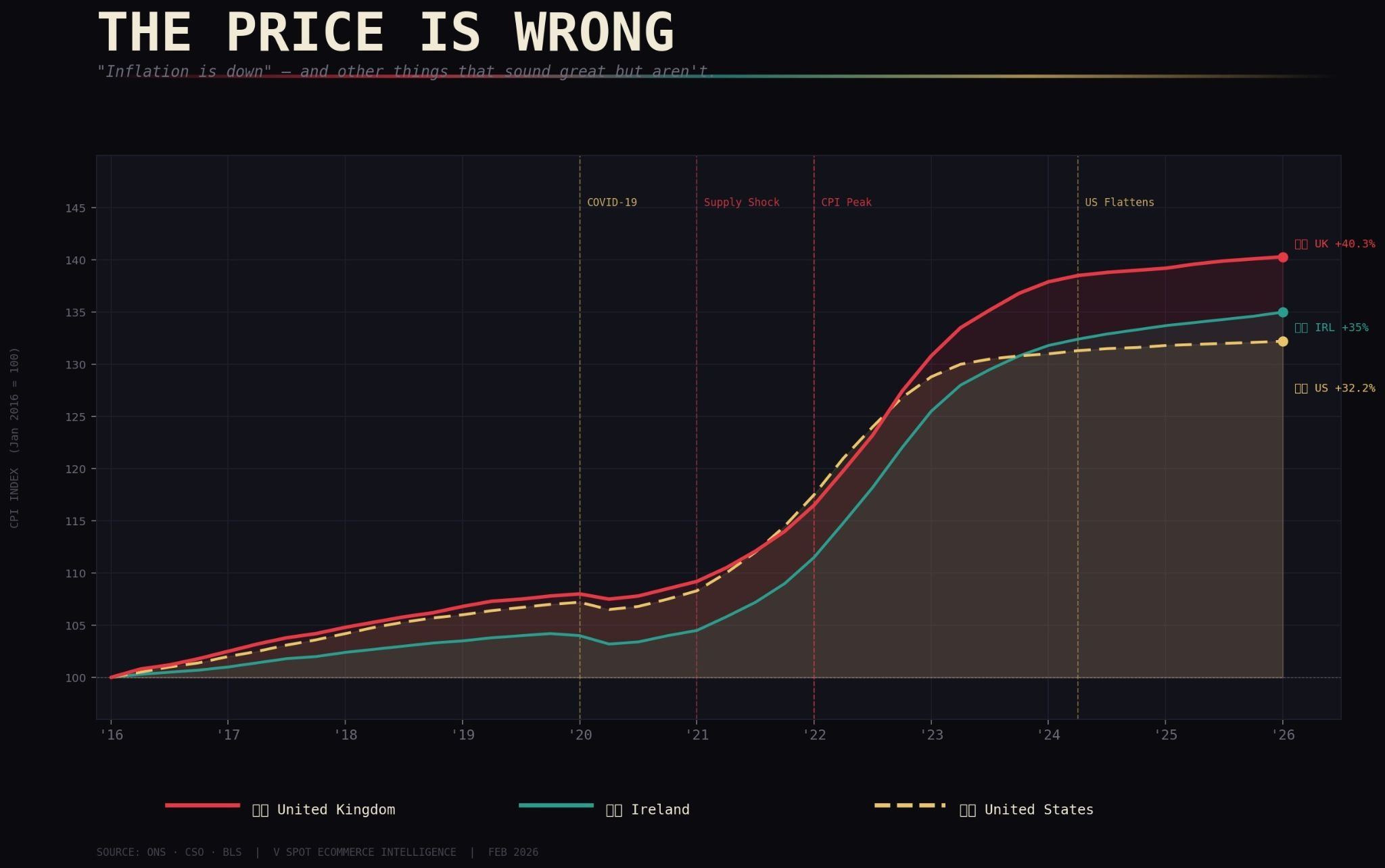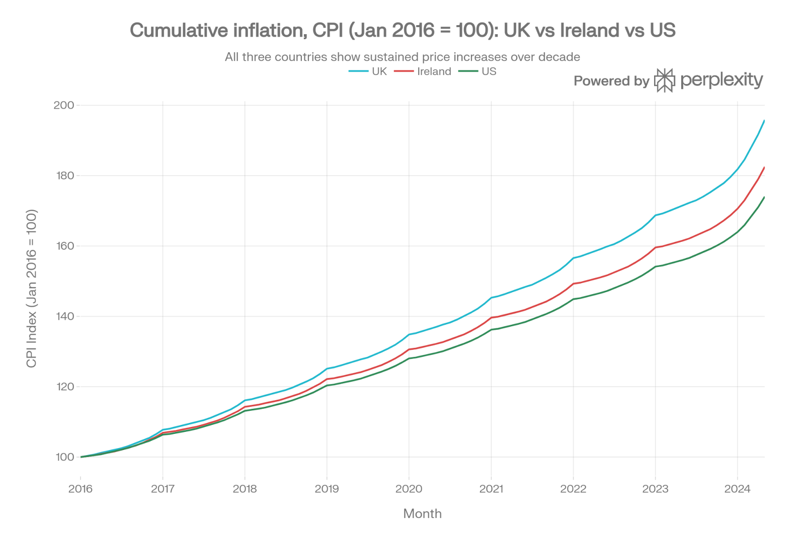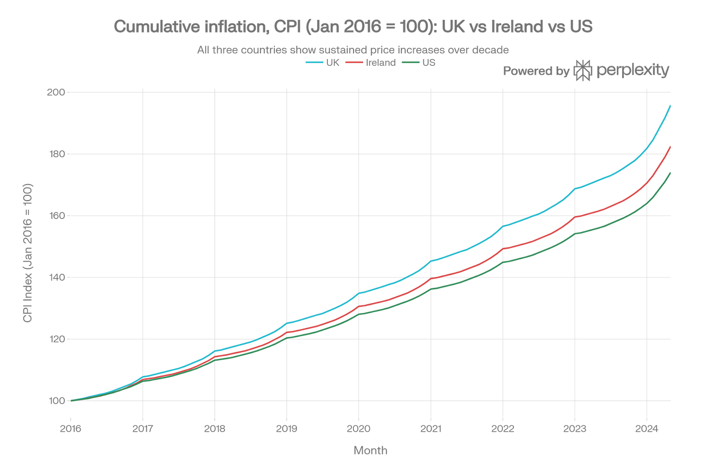 This happened everywhere. The US had its surge. Ireland had its energy and housing crunch. But when you plot the CPI of all three countries from 2016 to now, rebased to 100, the UK line sits highest. It rose more steeply, stayed elevated longer, and is only now cooling off the top of a higher mountain.