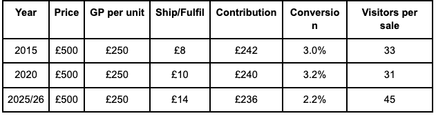 Your fulfilment is now around £14. Your contribution after shipping is £236, nominally only £6 less than 2015, which sounds fine until you realise that £236 today buys about £170 worth of 2015 business. Marketing. People. Stock. Overhead. It’s all more expensive.