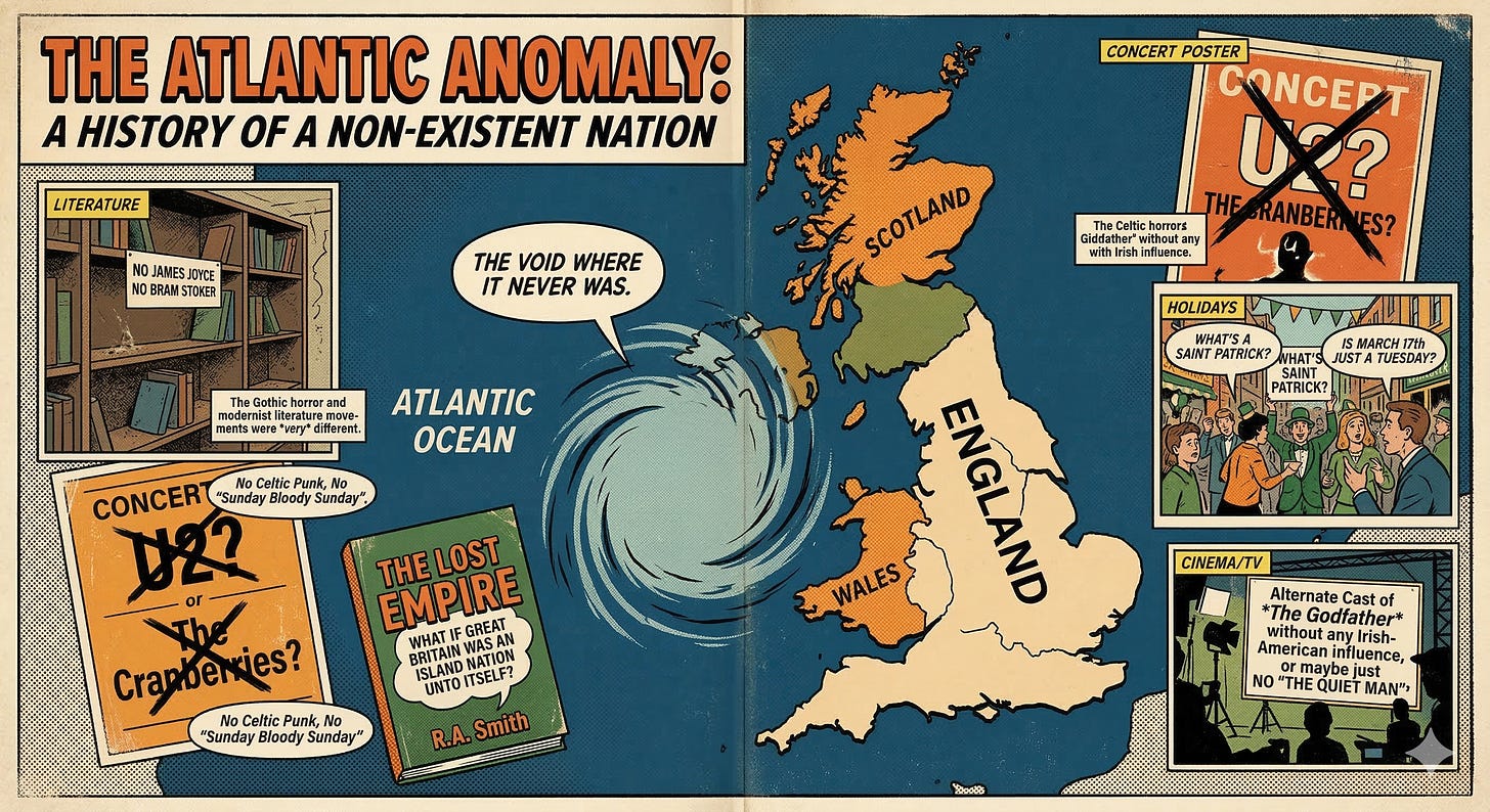 Ireland is, by most accounts, an island. It sits in the North Atlantic, slightly west of Britain, as if it was trying to leave a party early and got stuck at the door. Approximately 5 million people live on it. They have produced, per capita, more Nobel laureates, world-class writers, guilt, and unsolicited opinions about your mother’s cooking than any comparable landmass in recorded history. But what if the whole thing, the limestone, the rain, the GAA, the passive-aggressive hospitality, simply never happened?